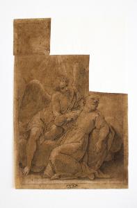 Una figura di anziano con indosso una tunica da prete si appoggia esausto ad una nuvola mentre viene sorretto da un angelo. Con la mano destra si slaccia leggermente il colletto mentre volge lo sguardo esausto verso l'alto. La figura angelica, vestita con un abito panneggiato, è anch'essa poggiata alla nuvola e osserva compassionevole il vecchio.
