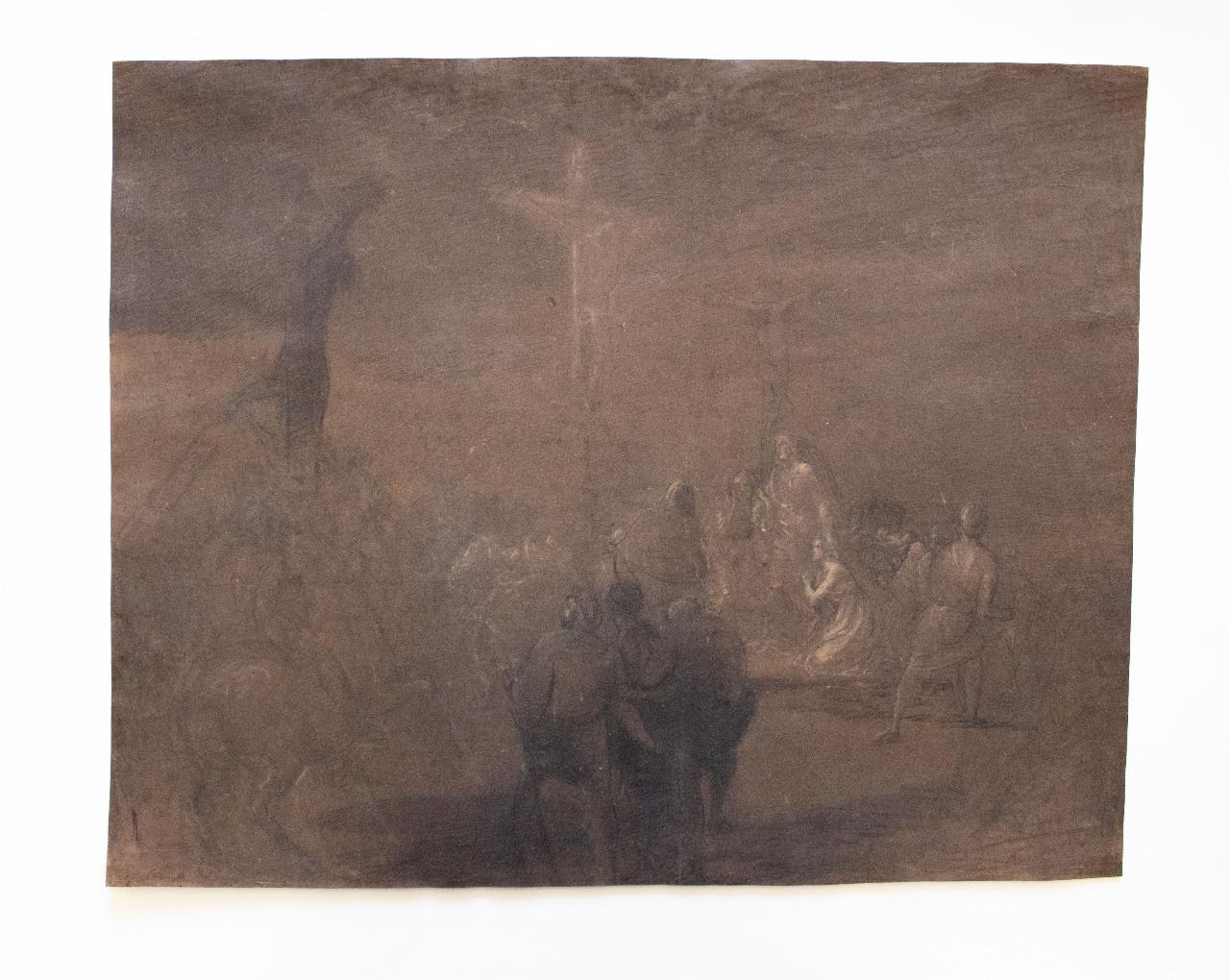 La drammatica scena mostra un folto gruppo di personaggi molti dei quali appena abbozzati e disposti attorno a tre croci con tre poveri corpi appesi ad esse. Nel primo piano della composizione tre figure si stringono a sé mentre osservano la pietosa scena. Queste sono tracciate con un intenso chiaroscuro in modo da creare un netto stacco con il resto del gruppo e dare profondità spaziale della scena. La stessa cosa vale per il il crocifisso a sinistra. Il punto di luce più intenso si ha invece sulla figura crocifissa centrale e la coppia che lo osserva da terra composta da un uomo in lunghe vesti ed una donna inginocchiata.