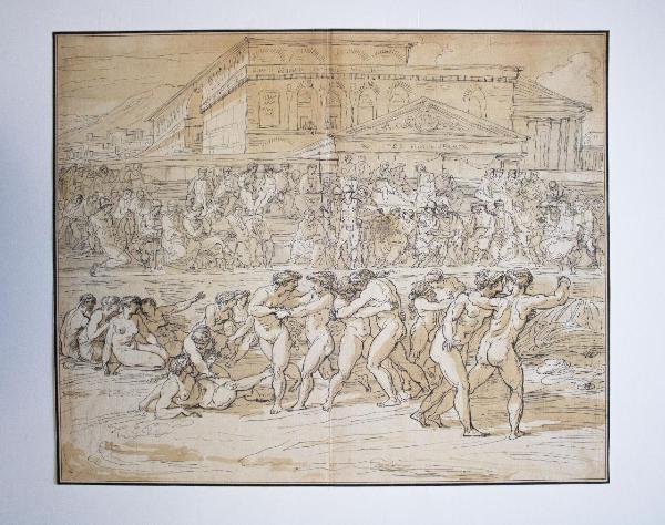 - NOTIZIE STORICO CRITICHE \nFelice Giani (San Sebastiano Curone 1758 - Roma 1823) fu uno dei massimi esponenti del neoclassicismo italiano. Studiò dapprima a Pavia, sotto la guida di Antonio Galli da Bibbiena, proseguendo poi gli studi a Bologna con Domenico Pedrini e Ubaldo Gandolfi. Furono molte le imprese che lo videro protagonista e che gli assicurarono fama e i peritura memoria. Tra queste ricordiamo la decorazione di Palazzo Altieri e del Palazzo Antonelli noto come le 100 finestre, dove Giani decorò le sale e le porte del piano nobile, riproponendo in maniera mirabile gli straordinari temi della "Domus Aurea". Cristoforo Unterperger lo ingaggiò per riprodurre gli ornati delle Logge di Raffaello in Vaticano, su encausti che poi furono inviati a Caterina II di Russia che le rimontò in un ambiente dell'Ermitage. Nel 1786 si trasferì a Faenza per decorare la Galleria del Palazzo Conti-Sinibaldi e la Galleria dei Cento Pacifici. Nel 1803 fu chiamato a Parigi per decorare i Gabinetti Napoleonici alla Malmaison. Nel 1811 fu nominato accademico di merito dell'Accademia di San Luca di Roma. Decorò in questi anni anche l'appartamento napoleonico al Quirinale.\n\nIl disegno, tipico dello stile bizzarro e personalissimo dell'autore, è da considerarsi come opera finita probabilmente realizzata per il collezionismo privato.