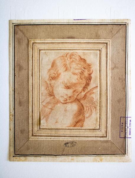 Un volto di angioletto con le spalle rivolte verso sinistra e il viso inclinato verso il basso girato nella direzione opposta. Le piccole ali velocemente abbozzate