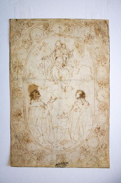 - NOTIZIE STORICO CRITICHE \nL'iconografia di questo bel disegno fa riferimento alla Madonna del Rosario. A suggerire tale ipotesi è la presenta delle sfere nel motivo decorativo ellittico. Tale soggetto è uno dei più importanti legati al culto cattolico dell'adorazione della Vergine ed ebbe larga diffusione soprattutto dopo la Controriforma. \nIl veloce schizzo denota grandi capacità disegnative. La scioltezza del segno e l'ottima resa delle posture e dei panneggi, nonostante la grande velocità impiegata nell'esecuzione, riflettono la mano di un disegnatore esperto ed esteticamente attento, forse operante in area bolognese.