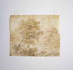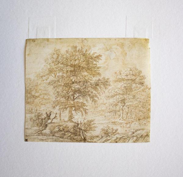 - NOTIZIE STORICO CRITICHE \nLa natura è l'assoluta protagonista di questa composizione eseguita probabilmente da un disegnatore miniaturista con la tecnica del puntinato. Non vi sono infatti linee che compongono il disegno, ma solo piccoli punti che creano l'illusione dei contorni e del chiaroscuro. Interessante la scelta di inserire una piccola figura umana, quasi a voler sottolineare il significato esistenziale della presenza dell'uomo nella vastità sovrastante della natura. \nMalgrado l'opera sia firmata e datata al verso non è stato momentaneamente possibile rintracciare l'autore di questa delicata opera.