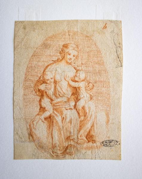 RECTO: Una figura femminile seduta con le vesti aperte ed i seni scoperti tiene sulle ginocchia due bambini. Uno di essi sta venendo allattato. Il gruppo è inscritto in un fondo ovale la cui area è riempita da un fitto tratteggio orizzontale.\nVERSO: Rifilata all'altezza del volto è delineata una figura maschile stante avvolta in una pesante mantella. Assicurato alle spalle spunta un lungo fucile.