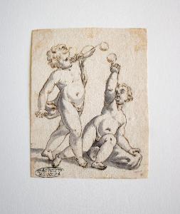 RECTO: Due putti ignudi sono intenti a giocare con delle bolle di sapone. Uno tiene con la mano sinistra una sottile cannuccia da cui fuoriesce una prima bolla mentre il compagno, seduto a terra, fa per sfiorare con le paffute dita un'altra bolla librata nell'aria.\nVERSO: uno studio di gamba a pietra rossa