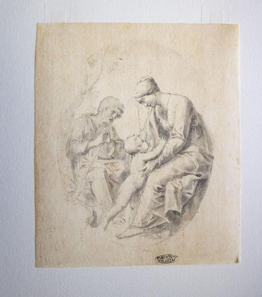- NOTIZIE STORICO CRITICHE \nLa rappresentazione della Sacra Famiglia è solitamente collegata con l'episodio del Riposo dalla fuga in Egitto. Narrato nel Nuovo Testamento in Matteo (2,13-23) e racconta che a seguito della visita dei re Magi, Giuseppe e la Vergine fuggono in Egitto dopo aver appreso che Re Erode vuole far uccidere tutti i bambini del suo regno. \nIl disegno non denota particolare qualità esecutiva. La tecnica timida e incerta si manifesta sia nella mancanza di modulazione del segno sia nella poca sensibilità con cui sono sovrapposte le velature dell'acquerello.