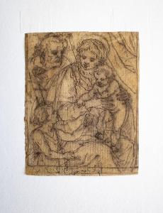 - NOTIZIE STORICO CRITICHE \nAl tema della Sacra Famiglia viene aggiunta anche la figura del San Giovannino che nell'offrire un pomo al Bambino si prefigura come colui che ne predicherà la venuta.\nDisegno modesto, potrebbe essere una copia tarda da una composizione di scuola genovese per la somiglianza dei volti con l'estetica di Lazzaro Tavarone (Genova 1556 - ivi 1640) o Giovanni Battista Paggi (Genova 1554 - ivi 1627)