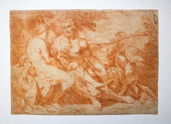 In un paesaggio boschivo, intervallato da dolci colline. Una coppia di amanti è seduta in atteggiamento lascivo. La donna poggia il braccio su una grossa clava, e tiene al suo fianco un fuso. Sulla destra un amorino sta per tendere un arco pronto a scoccare una freccia mentre un suo compagno pone sul proprio capo una pelle di leone.