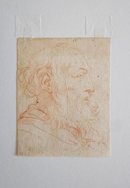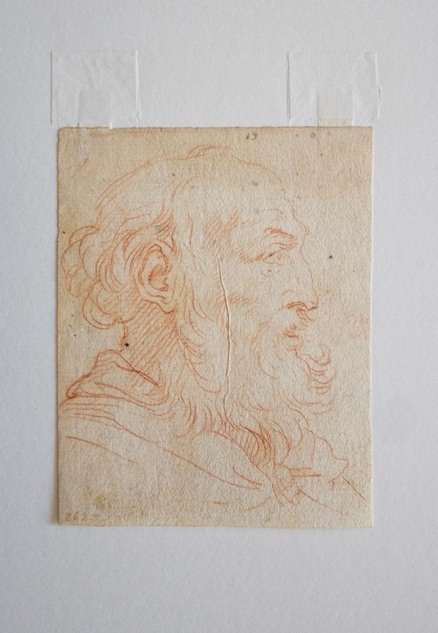 Testa di vecchio barbuto di profilo a destra. Ritratto d'uomo rivolto a destra