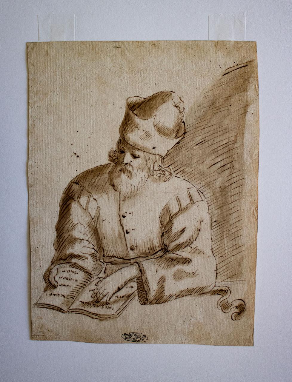 Una figura maschile a mezzo busto orientata verso sinistra nell'atto di leggere un libro.