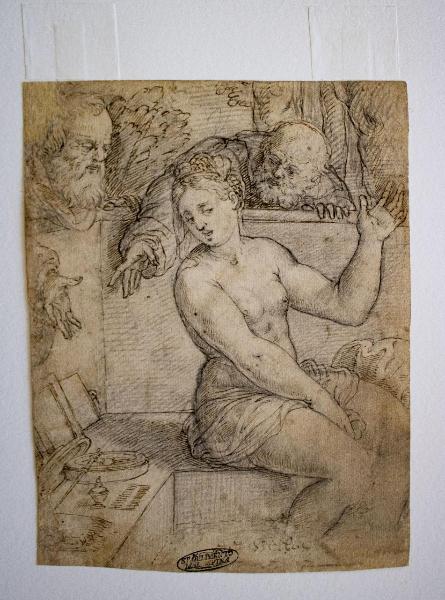 Una figura femminile ignuda è seduta su un muretto. Dietro ad esso fanno capolino due vecchi che si rivolgono alla giovane.\nAl verso tre figure maschili inginocchiate. Una di esse regge un bastone.