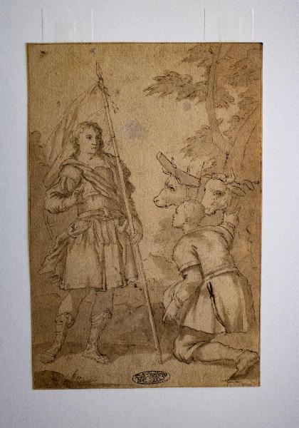 Sulla sinistra della composizione una figura stante di soldato con una lancia. Sulla destra un pastore inginocchiato con due buoi.\nAl verso uno studio di mano.
