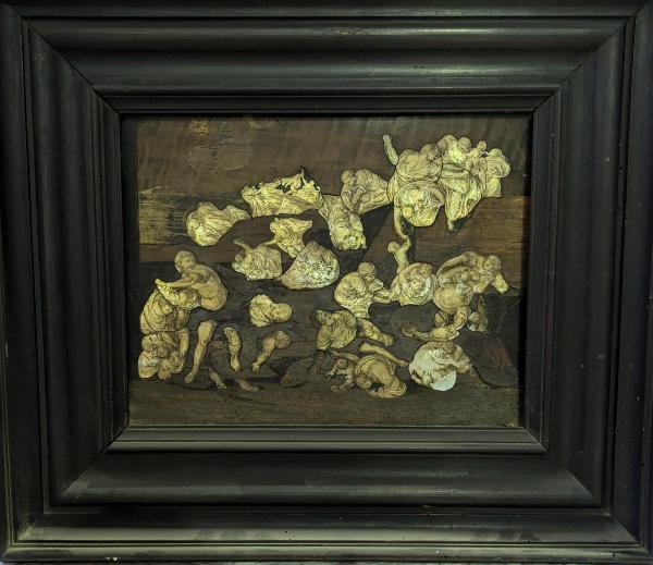L'intarsio raffigura una scena concitata in cui le donne stanno proteggendo i propri figli dalla furia degli uomini.