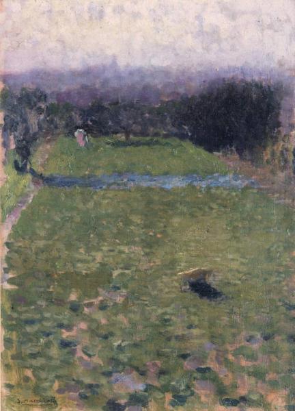 - NOTIZIE STORICO CRITICHE Facendo propria la lezione della pittura francese dell'ultimo quarto dell'Ottocento, Macchiati ottiene l'effetto di una veloce impressione dal vero, che suggerisce elementi della realtà - un ruscello al centro, una figura sullo sfondo, circondata da un bosco - negando loro caratteri di riconoscibilità in favore di una consonanza con la natura.