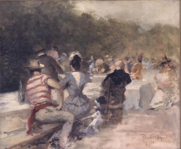 - NOTIZIE STORICO CRITICHE L'immediatezza della composizione, con i personaggi colti di spalle a loro insaputa, senza il tempo di assumere pose studiate ed eleganti, rimanda anche alle molte scene all'aperto sulle rive della Senna di Manet e di Renoir, seppure senza della solida costruzione del primo e senza i colori brillanti del secondo. Tuttavia, Pellegrini seppe costruire una sua maniera, elegante e piacevole, che ne decretò la fortuna presso il collezionismo privato.