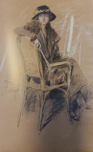 - NOTIZIE STORICO CRITICHE L'elegante ritratto femminile, caratterizzato dal segno vivace e frettoloso, è pervaso di forza e immediatezza, che si riscontrano nella luminosa e vibrante produzione di Scoppetta, che risente del fascino animato della Ville Lumière: l'artista infatti si reca a Parigi nel 1900 e ne diviene cronista, descrivendo i luoghi e i ritrovi mondani, e le eleganti donne del bel mondo, ritratte con pennellate veloci e una tavolozza vivace. Al suo ritorno a Napoli, si fa interprete della Belle Epoque partenopea, realizzando ricercati ritratti femminili. Il ritratto fu certamente realizzato al rientro dal viaggio compito a Parigi nel 1900, che si protrasse fino al 1909, ed è quindi riferibile agli anni Dieci del Novecento, sulla base della somiglianza con la Figura di donna sul divano e con i disegni dedicati ai mecenati Pietro Carrara e Maria Valdambrini. Le sembianze di quest'ultima, allieva, musa e struggente amore negli ultimi anni di vita del pittore, sembrano riproposti anche nel nostro disegno. Scoppetta trasferisce in quest'opera i fasti mondani della Belle Epoque parigina, come si vede nella posa, nei dettagli dell'abito, nell'espressione aristocratica, che sono debitori dell'esperienza maturata a Parigi come illustratore e della conoscenza della ritrattistica di Boldini e di Paul Helleu.