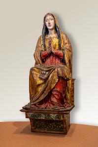 - NOTIZIE STORICO CRITICHE La statua costituisce forse la parte centrale del cosiddetto “Trittico dei Disciplini”, in origine posto sull’altare marmoreo della Disciplina di Castel Goffredo dedicata a San Giovanni Battista. Dal punto di vista stilistico la Madonna rimanda alle cadenze lente e ai gesti misurati propri di Andrea Mantegna. La geometria del volto e la monumentalità dell’insieme richiamano inoltre i modi di Piero della Francesca, che nella Verona di metà Quattrocento penetrarono grazie alla mediazione pittorica di Francesco Benaglio e dell’intarsiatore Fra Giovanni, quest’ultimo in colloquio diretto con personalità del calibro di Mantegna. L’ambito di produzione della scultura è da identificare con quello veronese di una bottega senza dubbio prossima a quella di Giovanni Zebellana o dei Giolfino, considerati tra i maggiori interpreti dell’arte mantegnesca nel legno. La presenza di tre sculture (Madonna orante, San Giovanni Battista, San Sebastiano) di alta qualità, in origine nel medesimo luogo, suggerisce che la confraternita dei Disciplini volle lasciare un segno tangibile e perenne dei valori in cui credeva e nei quali si identificava, quelli di una comunità sensibile al culto, ai valori civili e alla bellezza artistica\n