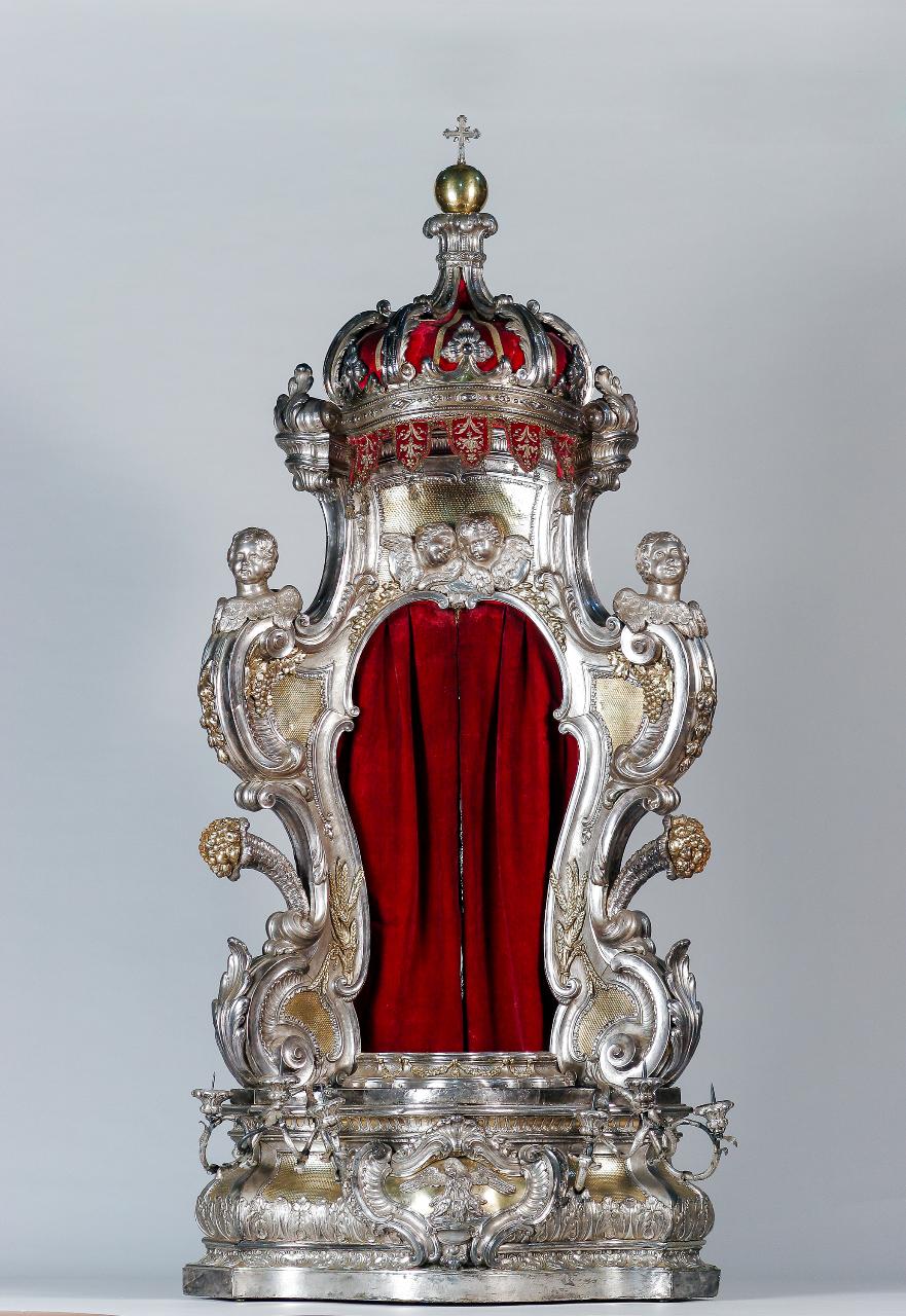 L’imponente espositorio del Santissimo Sacramento a foggia di trono è in lamina di argento sbalzata su supporto ligneo. L’alto basamento dal profilo mistilineo è delimitato da una serie di cornici che ne sottolineano la struttura. Ampie volute fogliacee dalle quali si sviluppa un sistema di cornucopie e cherubini alati, definiscono un profilo elaborato con rilievi plastici accentuati da effetti pittorici derivanti sia dal diverso trattamento delle superfici, sia dal contrasto tra argento e parti dorate. L’opera è curata in ogni dettaglio anche nella lavorazione della parte lignea retrostante che, intagliata, gessata e rivestita di foglia d’argento, fu concepita come un tutt’uno con quella a vista. Il trono presenta tre punzoni: il Giglio araldico della bottega di Giovanni Bellavite, il “Sacro Vaso” entro cornice rettangolare (bollo di garanzia pubblica della lega metallica) e il bollo con le lettere “SIC” (Sanguis Iesus Christi) inserite entro crescente lunare.