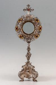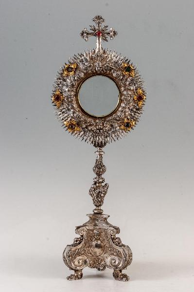 Tre piedi a zampa leonina sostengono la base a sezione triangolare con facce sagomate da volute fitomorfe contrapposte e poco aggettanti. Il nodo del fusto, a fusione, è decorato con putti alati aggettanti tra elementi vegetali. Il ricettacolo, a corti e fitti raggi fiammati, con testine angeliche tra nubi, è sormontato da crocetta apicale sicuramente di fattura settecentesca. Poco prima del 1762, infatti, l’ostensorio fu arricchito con fasci di raggi dorati e cristalli circolari molati, come risulta da un inventario datata del 1762. In quest’ultimo viene inoltre precisata la fonte del denaro per l’intervento nelle “limosine della chiesa”.