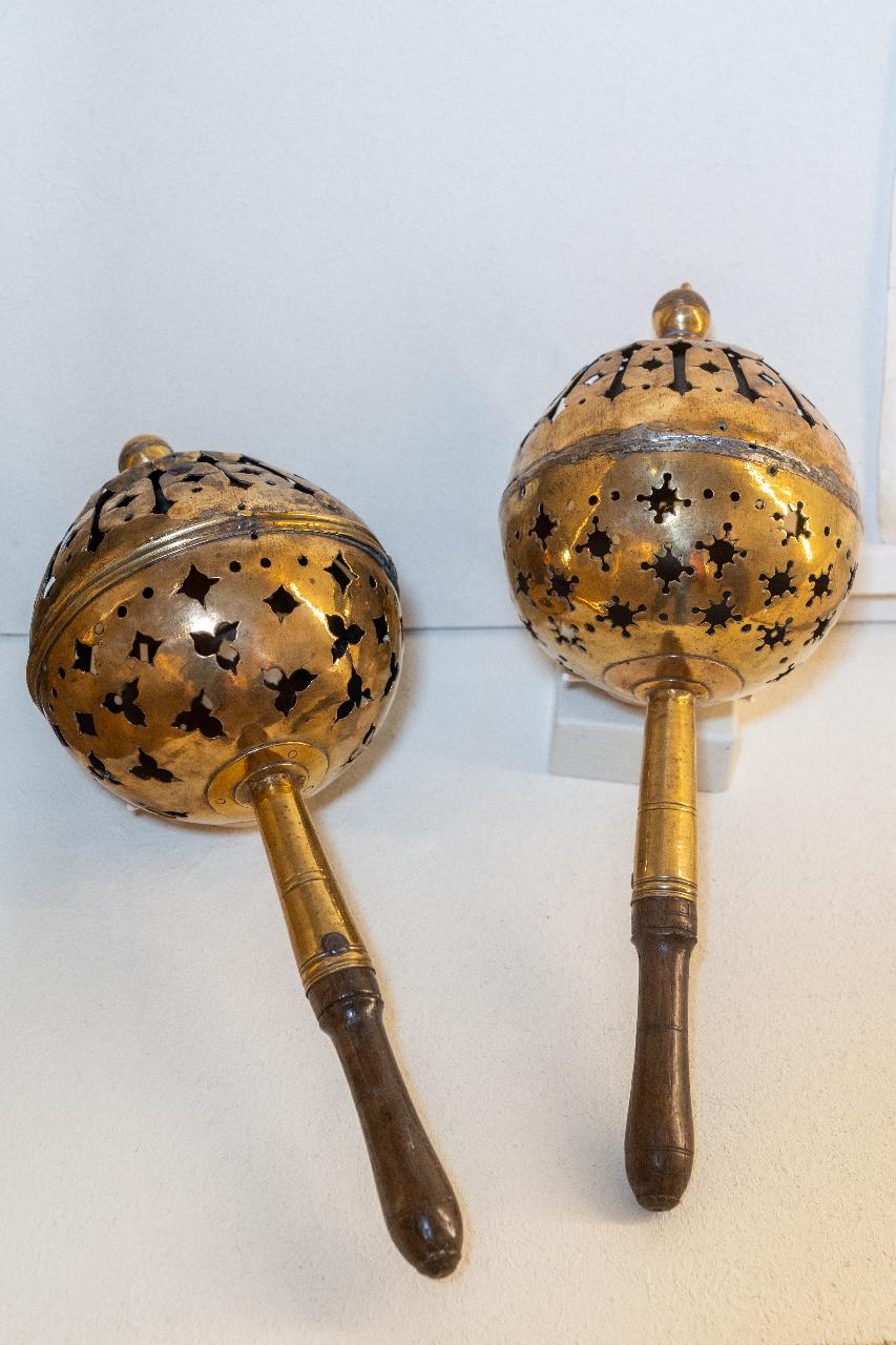 - NOTIZIE STORICO CRITICHE I due manufatti in lega di rame dorato traforato e legno sono il risultato di un adattamento settecentesco di una coppia di rimmonim ebraici, probabilmente provenienti dalla comunità ebraica di Castel Goffredo, attestata in loco dalla metà del Quattrocento sino alla metà del Settecento. Il nome del frutto rimmon o melagrana (al plurale rimmonim) presta il suo significato simbolico ad uno degli oggetti della liturgia ebraica. I rimmonim sono infatti parte dell’ornamento che riveste il rotolo di pergamena su cui è scritto il Pentateuco o Libro della Legge (Torah). Il rotolo si svolge su due bastoni di legno con punte dorate circondate dalla corona. L’uso dei rimmonim risale alla fine del Medioevo quando le punte delle aste di legno ebbero come ornamento i terminali di metallo variamente decorati.\n\n\n\n
