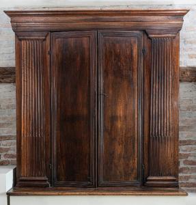 Le dimensioni originali e alcune parti del mobile sono state modificate. Di impianto semplice e rigoroso presenta due ante con ai lati due lesene a colonna scanalata e rudentata, sormontate da capitelli di ordine tuscanico. La cornice che delimita il mobile nella parte superiore è il frutto di un restauro ottocentesco. Nella fascia liscia sottostante si legge la dicitura “DOTTRINA CRISTIANA”: una scritta ottocentesca dipinta a caratteri chiari che indica la destinazione d’uso che il mobile ha assunto che forse aveva fin dall’origine; la trabeazione superiore è completata da una serie di listelli digradanti.\n\n
