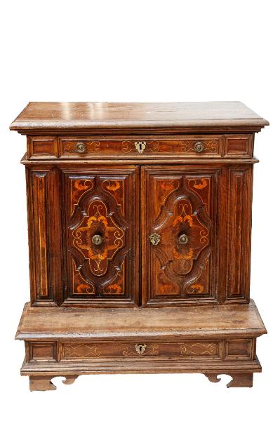 - NOTIZIE STORICO CRITICHE Il motivo delle foglie intarsiate a due colori trova riscontro nell’ebanisteria cremonese e ha il suo archetipo nel coro della chiesa di San Sigismondo a Cremona (1603) così come di matrice piacentina è il disegno delle formelle che decorano i cassetti e che ricorda una doppia tenaglia. È comunque probabile che sia stato realizzato da un artefice locale attivo nella seconda metà del Settecento forse ispiratosi a uno dei modelli sopra citati. Per quanto riguarda gli inventari non è possibile individuare l’inginocchiatoio in esame tra i tanti “scanelli di noce” citati senza alcun preciso riferimento.\n\n\n