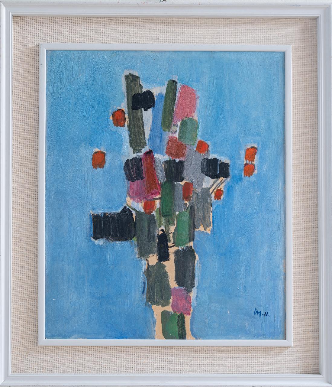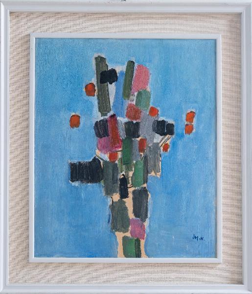 Il dipinto è realizzato a olio su tavola di compensato rettangolare inserita entro una cornice lignea. Il soggetto raffigura un mazzo di fiori astratto giocato sulle tinte del nero, grigio, rosa e verde in contrasto con l’azzurro del fondo. L’opera è siglata in basso a destra “M. N.”.