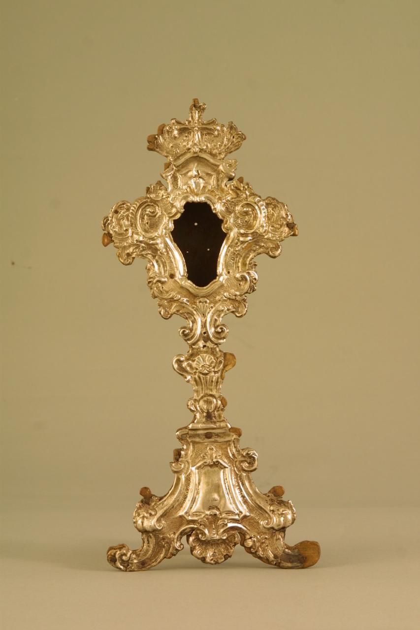 Il reliquiario a ostensorio si presenta con piedi a voluta raccordati da motivo a conchiglia, base triangolare con specchiatura mistilinea, fusto a lampione centrato da conchiglia e ricettacolo privo di reliquia. Quest’ultimo è caratterizzato da mostra mistilinea sagomata con volute, ornati fogliacei e rocaille su fondo puntinato. Il timpano curvilineo è sormontato da crocetta tra fogliame.