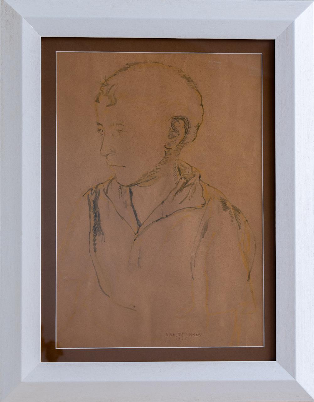 Il disegno è eseguito su un foglio di carta bianco inserito entro cornice lignea bianca di fattura recente. Il soggetto raffigura un busto maschile di giovane posto di tre quarti. L’opera è firmata e datata in basso al centro “Oreste Marini / 1955”.