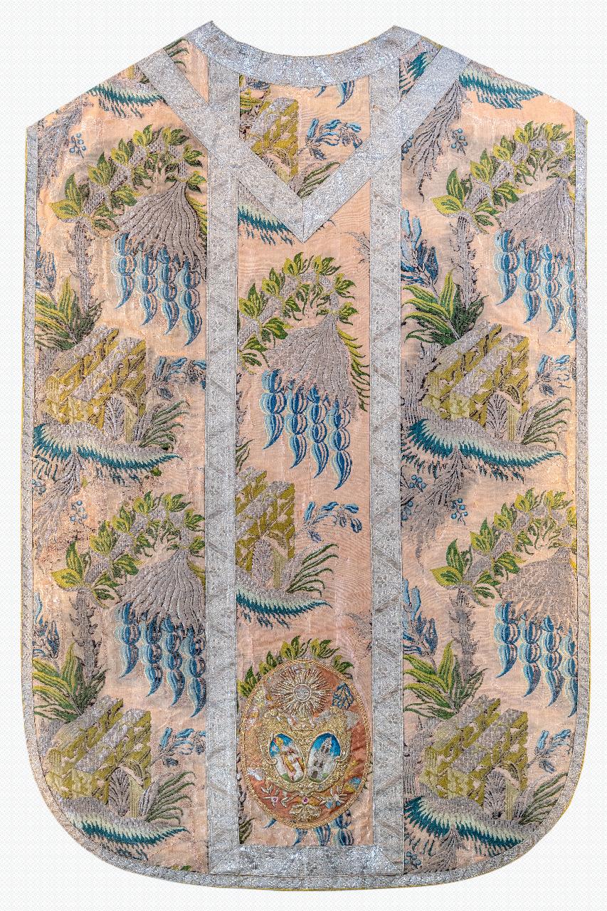 - NOTIZIE STORICO CRITICHE Piuttosto inconsueto nell’impostazione, che affianca infiorescenze isolate fuori scala ad elementi architettonici, il tessuto in origine era destinato all’abbigliamento femminile, come si desume da un inventario parrocchiale in cui si legge “abito da donna smontato”. Nei secoli scorsi era infatti prassi donare alle chiese vesti preziose che venivano smembrate e ricomposte per realizzare le vesti liturgiche. È probabile che il tessuto in esame sia stato utilizzato in origine per confezionare un abito da sposa e che il dono sia stato molto apprezzato, soprattutto se si considera che liturgicamente il rosa è il colore più raro, essendo usato solo due volte l’anno, ossia nella III domenica di Avvento e nella IV domenica di Quaresima. La struttura compositiva di ampie dimensioni modulari è riconducibile al decoro definito “a isolotti”, affermatosi in Francia nel quarto decennio del XVIII secolo, in cui si mescolano elementi architettonici e naturalistici definiti da una grafia precisa e da una sapiente resa volumetrica dovuta alla presenza delle trame broccate proposte in varie gradazioni tonali. È da porre in risalto la presenza dei due elementi architettonici con arco a tutto sesto, proposti quasi sotto forma di rudere archeologico e sapientemente risolti al fine di evidenziare le peculiari caratteristiche formali messe in risalto dalla particolare lumeggiatura, senza essere soffocati dall’esuberanza dei motivi floreali. Questi ultimi si caratterizzano per l’estrema fantasia e la resa tridimensionale che, insieme, rimandano, al ricercato mondo esotico particolarmente apprezzato all’epoca. L’impiego delle trame metalliche aggiunge preziosità e tocchi quasi astratti. Sul retro della pianeta, si identificano tre stemmi: la figura di Sant’Erasmo v.m., copatrono e titolare della chiesa prepositurale di Castel Goffredo; l’ostensorio raggiato, simbolo della Compagnia del SS. Sacramento e l’arme della Città.\n\n\n\n