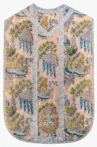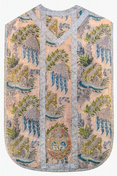 Tessuto operato a fondo taffetas rosa. Motivo ad andamento sinuoso creato da tralci argentati stilizzati con spine, le cui anse sono campite da due elementi architettonici rettangolari affiancati in diagonale, di cui uno, il più esterno, presenta al centro un arco a tutto sesto strombato. Attraverso quest’ultimo si riconoscono elementi fitomorfi. I tralci sostengono il calice del fiore da cui ricadono stami a grappolo composti da più sfere sulle tonalità dell’azzurro. Sul retro della pianeta, nella zona inferiore della colonna centrale, è applicato un tessuto diverso fondo rosa più carico, sul quale sono stati ricamati tre stemmi che raffigurano Sant’Erasmo v.m., l’ostensorio raggiato e l’arme della Città. I galloni sono tessuti in seta bianca ed argento filato con un motivo a piccole corolle a cinque petali alternante ad un nastro zigzagante.
