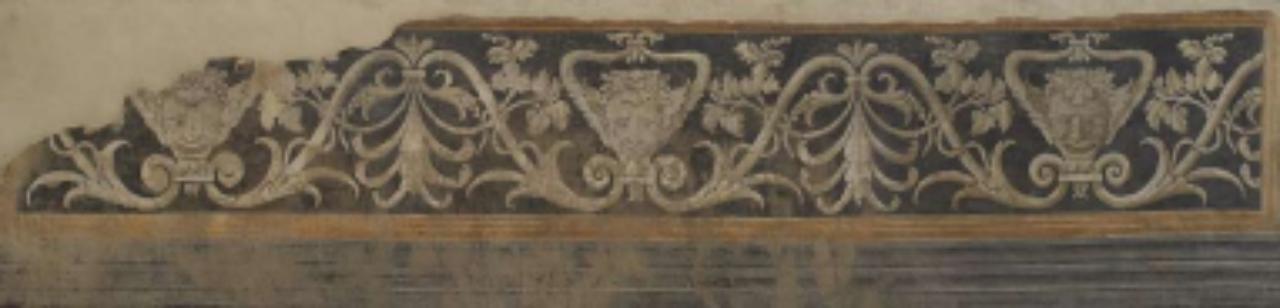 Fregio proveniente dal complesso della Basilica di Sant'Andrea, affresco strappato nel 1972 ca.. Il fregio presenta mascheroni e elementi fitomorfi e foglie di acanto intrecciati su fondo blu entro cornice.