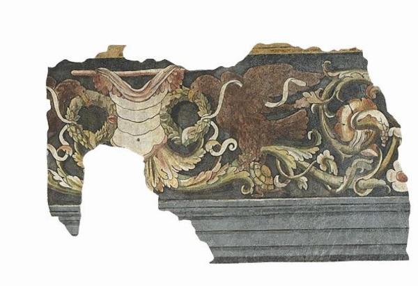 Fregio proveniente dal complesso della Basilica di Sant'Andrea, affresco strappato nel 1972. Il fregio presenta un architrave grigio e un ornato corrente su fondo scuro, interrotto da specchiature di marmo verde, tralci vegetali policromi con fioroni, aquile con ghirlande, tartarughe e armature.