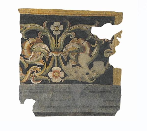 Fregio proveniente dal complesso della Basilica di Sant'Andrea, affresco strappato nel 1972. Il fregio presenta un architrave grigio e un ornato corrente su fondo scuro, interrotto da specchiature di marmo verde, tralci vegetali policromi con fioroni.