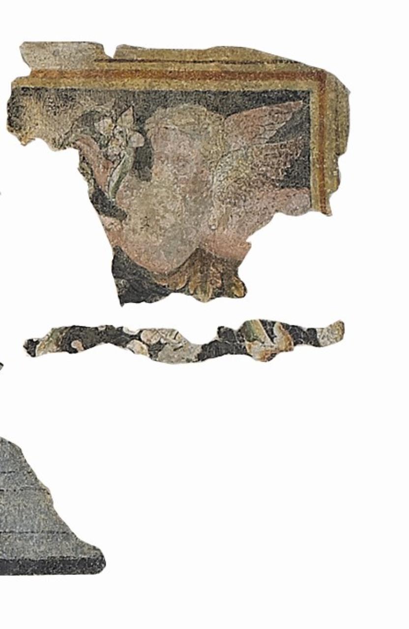 Fregio proveniente dal complesso della Basilica di Sant'Andrea, affresco strappato nel 1972. Il fregio presenta una cornice architettonica color ocra con fregio costituito da girali policromi, con fogliami, fioroni e un putto, su fondo scuro.