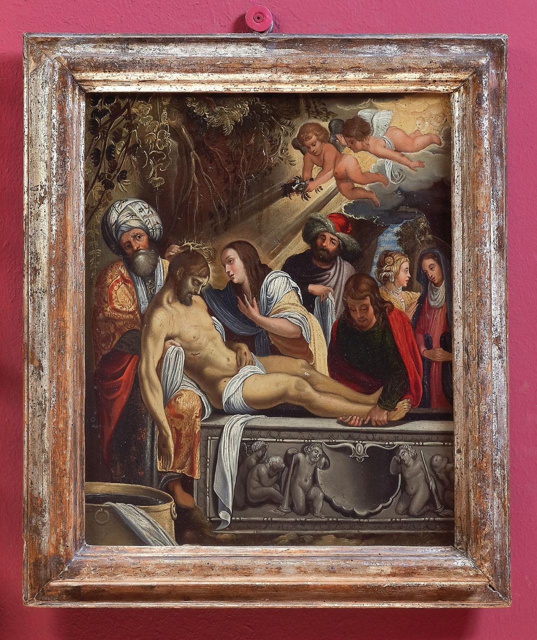 Personaggi: Cristo deposto, Giuseppe d'Arimatea, Maddalena, san Giovanni, Nicodemo, figure dolenti, angeli. Oggetti: sepolcro, catino con asciugamano, corona di spine. Paesaggio: alberi, rami con foglie.