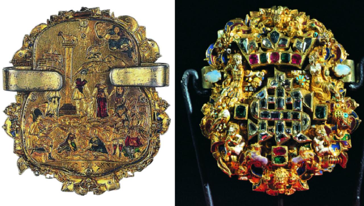 Fregi e incisioni: trigramma del nome di Gesù, Padre Eterno, figura maschile e femminile, putti, corona, figure di cavalli. Materiali: oro, parzialmente smaltato, diamanti, rubini, opali, perle. Retro: incisione con episodio dell'Adorazione del vitello d'oro con Mosè che spezza le tavole della legge.