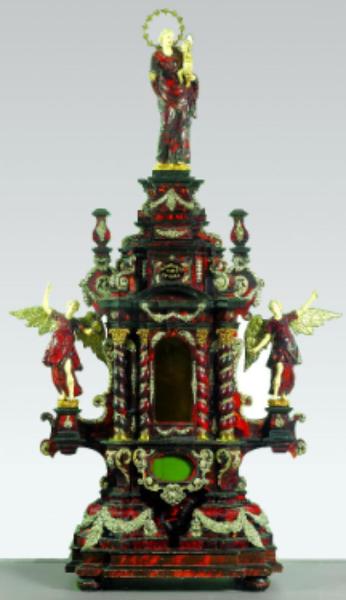 Fregi e particolari: lamine in metallo sbalzate, struttura a tempietto con guglia, colonnine tortili binate, cimasa gradinata, tre statuette (angeli e Madonna con Bambino), festoni e girali argentati. Iscrizioni: "S. ADRIANI CAPUT ET OSSA". Materiali: osso di tartaruga, ebano, avorio, argento.