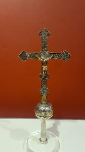 Personaggi al recto: Cristo crocifisso, Padre Eterno, Madonna, Giovanni evangelista, Maddalena, San Sebastiano. Personaggi al verso: Angelo annunciante, San Lorenzo, San Giovanni Battista, San Paolo, Sant'Antonio abate. Animali: Pellicano mistico. Fregi e incisioni: fiori e meandri vegetali a smalto, foglie di acanto, nodo a gocce.