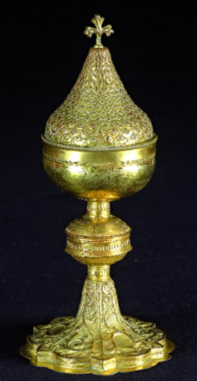 Fregi e incisioni: base mistilinea, specchiature a motivi vegetali con clipei e candelabre, nodo a doppia valva a squamette con fascia centrale, coppa liscia con labbro a cordoncino, coperchio con piumette e foglie, crocetta apicale a foglie.