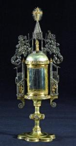 Fregi e incisioni: base esalobata liscia, fusto con collarino a foglie, nodo a chiodi romboidali sporgenti, bordo coppa a fogliette, teca a tempietto gugliato, archi rampanti con santi (Pietro e Paolo), volute a foglie e fiori, edicola apicale con Madonna con Bambino, crocetta apicale raggiata.