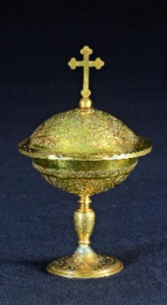Fregi e incisioni: base circolare con intrecci vegetali, fusto con nodo a balaustro con fregi vegetali, coppa con intrecci di rami e bordo a fogliette lanceolate, coperchio a calotta schiacciata con fregi e intrecci vegetali, crocetta polilobata su globo apicale.