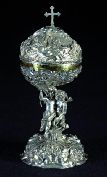 Fregi e incisioni: base mistilinea bombata con fregi a conchiglia e creste ondose, fusto con angeli a tutto tondo, coppa e sottocoppa con angeli nuvole e riccioli, coperchio con raffigurazione evangelisti, orlo decorato a punzoni, crocetta apicale polilobata.
