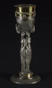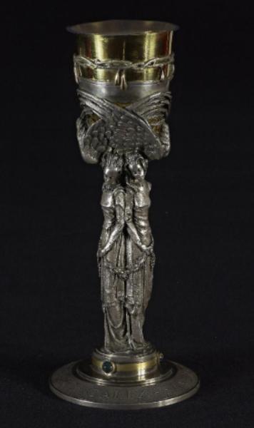 Fregi e incisioni: piede circolare con base aggettante con fascia arricchita con pietre dure, fusto formato da tre figure angeliche, sottocoppa formato dalle ali delle figure sottostanti, fascia della coppa formata da corona di spine e gocce di sangue. Iscrizioni: "HIC EST CALIX SANGUINIS MEI".