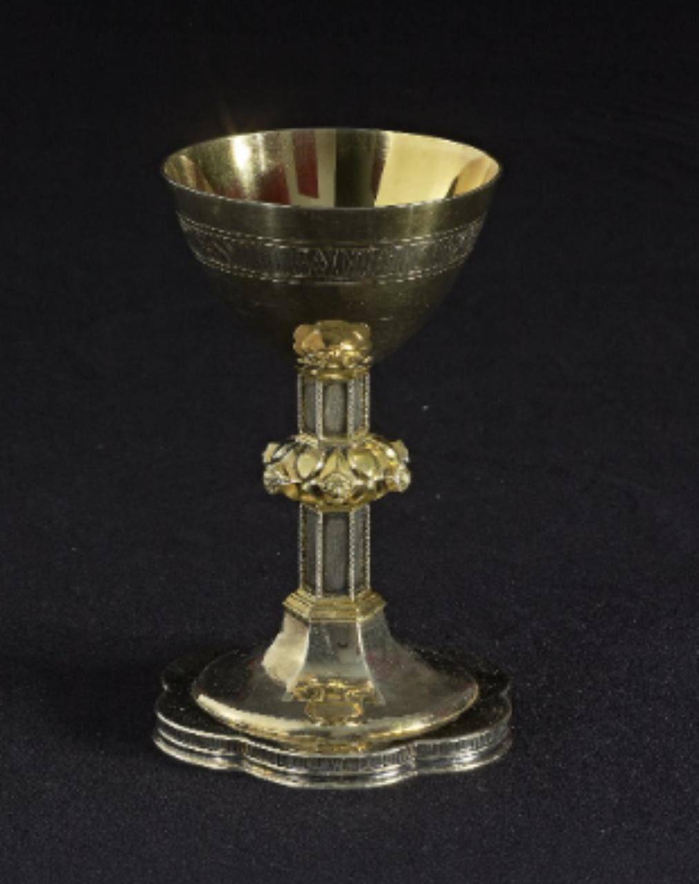 Fregi e incisioni: base polilobata esagonale, fusto con gradini e spigoli tortili, nodo con teste di leoni sporgenti romboidali, coppa liscia con unica fascia con iscrizione a caratteri gotici. Iscrizioni: "ORATE PRO MULIERIBUS BRITTANNIAE, ORATE PRO ANIMAM MEAM IN ... "