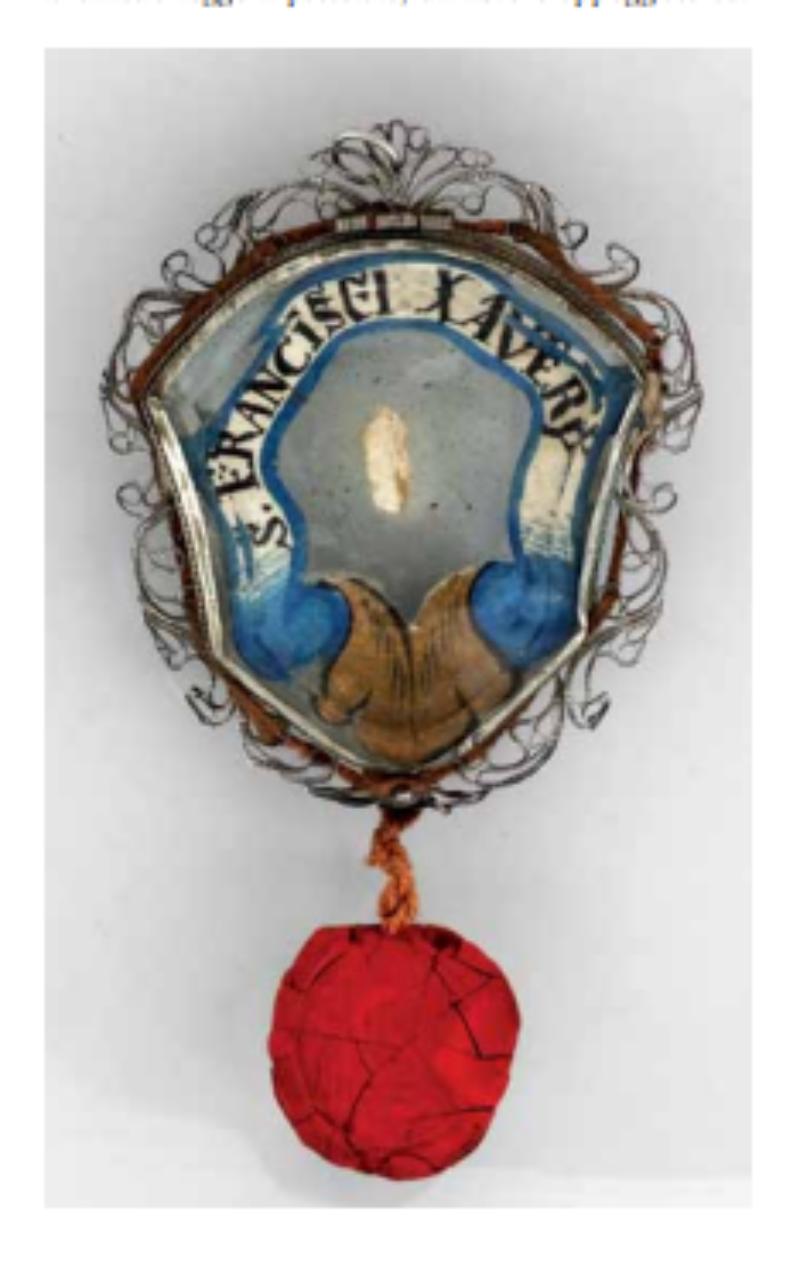 Fregi e incisioni: cornice modanata a riccioli. Iscrizioni sulle cedule al recto «S. FRANCISCI XAVERY», al verso «EX OSSIBUS».