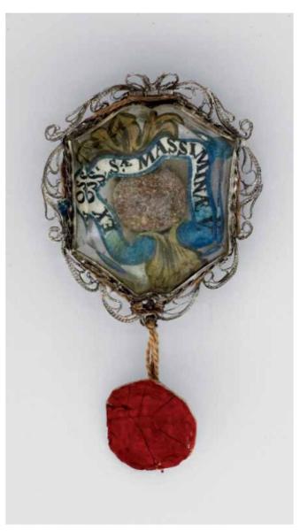 Fregi e incisioni: cornice modanata a riccioli. Iscrizioni sulle cedule al recto e al verso: «EX OSS. S.æ MASSIMINÆ V.».