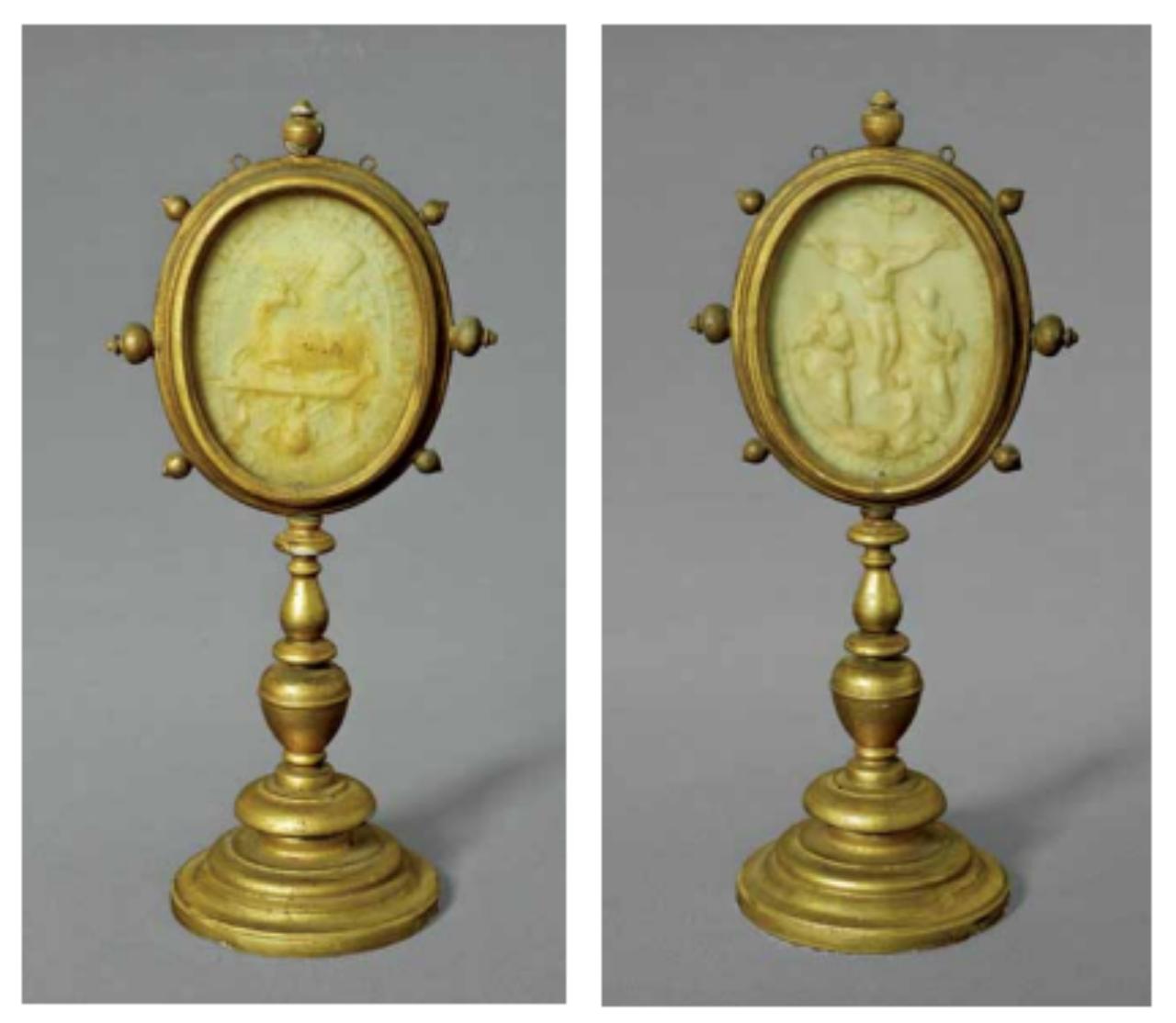 Fregi e incisioni: piede e fusto modanato lisci dorati, cornice liscia ovale con sette ovoli, bassorilievi in cera al verso Agnello mistico, al recto Crocifissione. Iscrizioni: impresso sulla cera, al recto nel giro «ECCE A. DEI QUI TOLLIT. P. M. / G. XIIII P. M.»; al verso nel giro «AN. PR. OCCISUS AB ORIGINE MUNDI GREG XIIII PON. MAX».