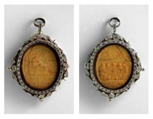 Fregi e incisioni: cornice modanata, bassorilievi in cera al recto Agnello mistico, al verso figure inginocchiate con illuminazione divina. Iscrizioni: impresso sulla cera, al recto «ECCE AGNUS DEI QUI TOL. P. MUNDI» all’esergo «INNOCEN. XI / PONT. MAX / A. VII»; al verso all’esergo «INNOC. XI / […]».