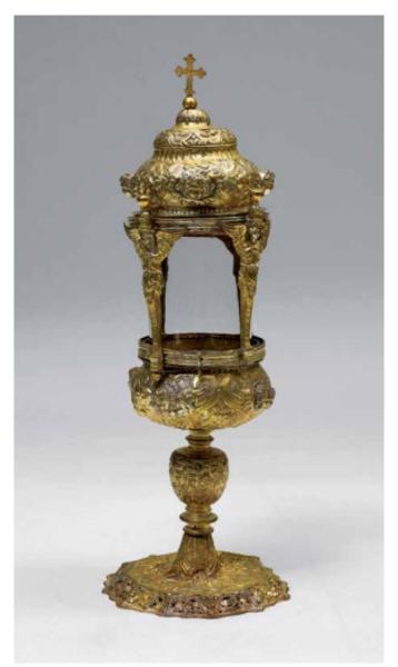 Fregi e incisioni: piede a sezione esagonale mistilinea con dodici punte frastagliate con teste di cherubini e mannelli di spighe di grano con girali di uva, nodo centrale ad oliva con tre teste di cherubini che sorreggono drappi, sottocoppa bombato con nuvole e cherubini, teca con quattro cariatidi che sorreggono un coperchio a doppia calotta con cespi di foglie e croce latina apicale.