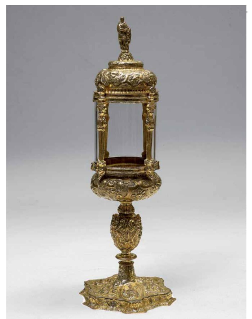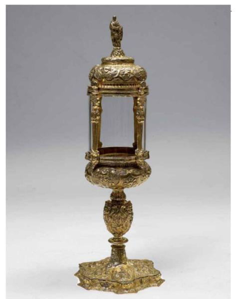 Fregi e incisioni: piede a sezione esagonale mistilinea, orlo inclinato con teoria di fogliette, sei teste di cherubini, alternate a tre cartelle ovali che racchiudono le immagini: della Madonna con il Bambino, di S. Nicola da Tolentino e S. Agostino vescovo; nodo centrale ad ‘oliva schiacciata’ puntinato e con tre teste di cherubini; sottocoppa con modanature e fiori, cariatidi che sorreggono la copertura a doppia calotta modanata con statuetta di S. Martino stante.